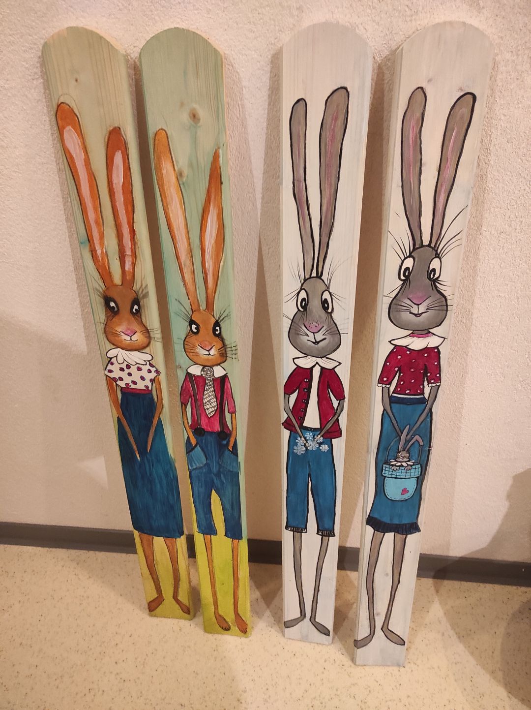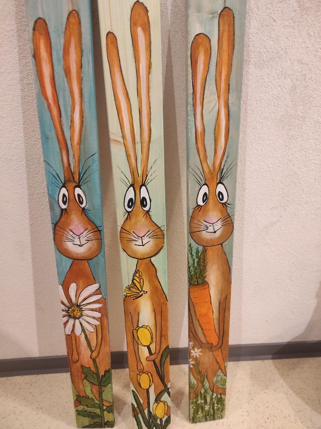 Witzige Osterhasen auf Holzlatten